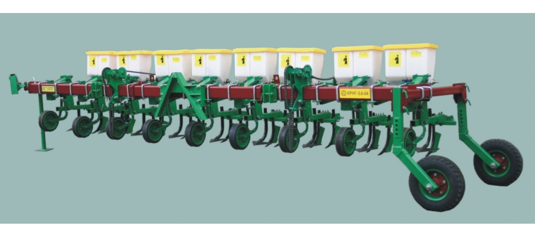Культиватор навесной КРНГ-5,6 предназначен для междурядной обработки и подкормки посевов, пропашных и овощных культур с междурядьями 45 и 70 см. Обеспечивает качественное рыхление почвы на заданную глубину с уничтожением сорняков. В культиваторе применена маятниковая подвеска опорного колеса секции которая, обеспечивает бесступенчатое регулирование глубины обработки в пределах 90 мм, а эксцентриковое крепление грядиля позволяет производить групповую регулировку угла атаки рабочих органов. Параллелограммный механизм навески секций обеспечивает точное копирование рельефа поля и поддерживает постоянную глубину обработки почвы. Туковысевающая система обеспечивает высев минеральных удобрений и их смесей в гранулированном и кристаллическом видах в зону корневой системы растений при подкормке.